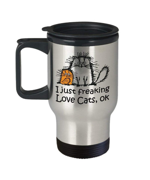 MORI-TM, Travel Mug - I Just Freaking Love Cats, OK 14oz Stainless Steel Double Wall Coffee Cup with Handle and Lid – Best Funny Cat Gift for Men Women Dad Mom Boy Girl
