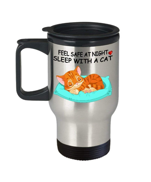 MORI-TM, Travel Mug - Feel Safe At Night Sleep With A Cat 14oz Stainless Steel Double Wall Coffee Cup with Handle and Lid – Best Funny Cat Gift for Men Women Dad Mom Boy Girl