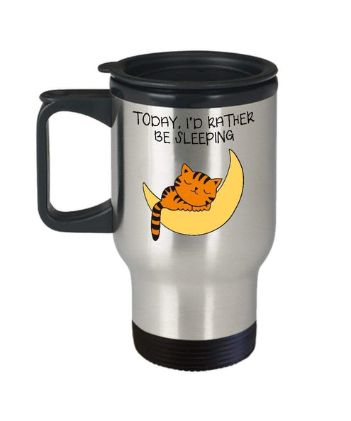 MORI-TM, Travel Mug - Today I’d Rather Be Sleeping 14oz Stainless Steel Double Wall Coffee Cup with Handle and Lid - Best Funny Cat Gift for Men Women Dad Mom Boy Girl