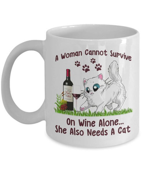 Coffee Mug - A Woman Cannot Survive on Wine Alone She Also Needs a Cat - 11oz and 15oz White Black Ceramic Cup – Best Funny Cat Gift for Men Women Dad Mom Boy Girl